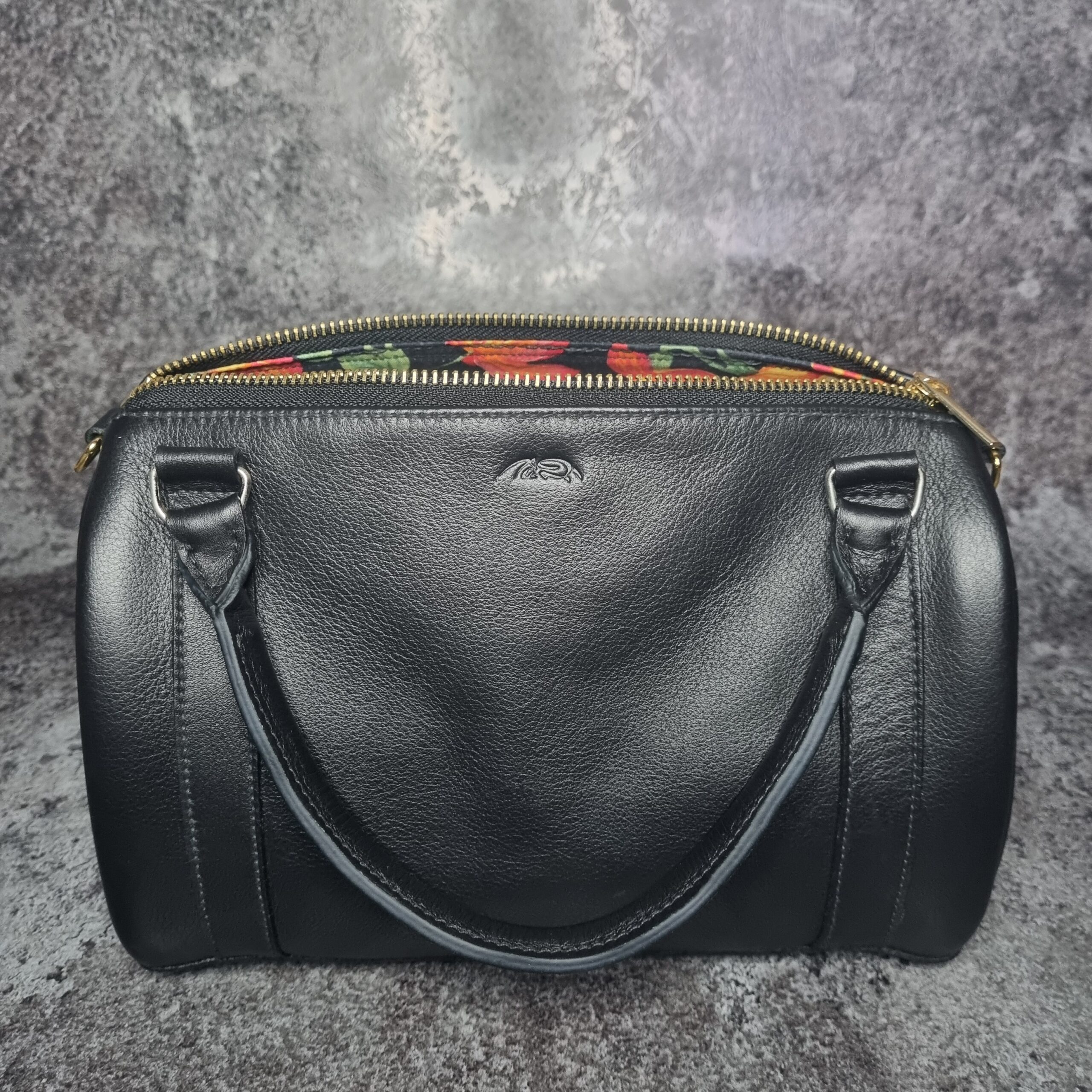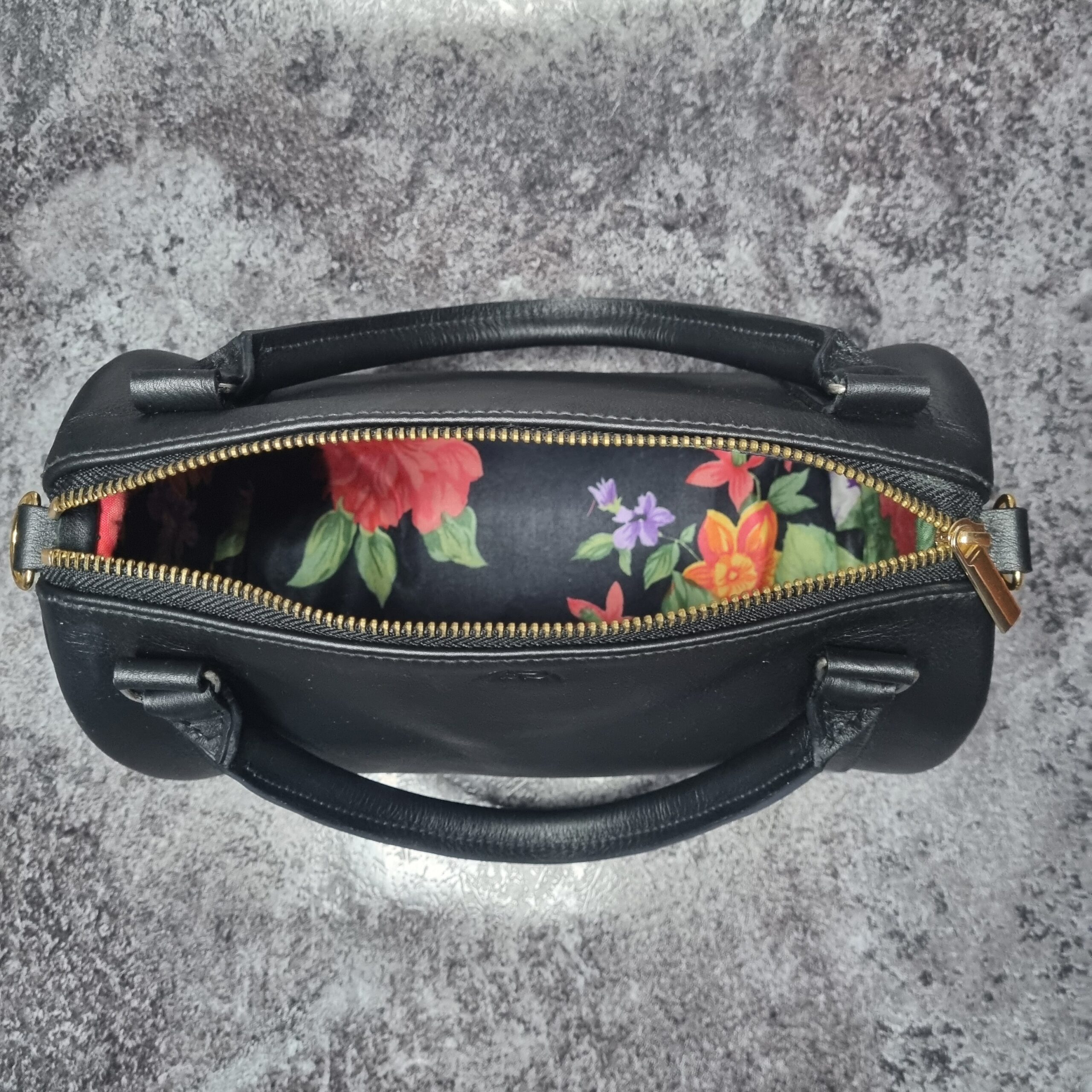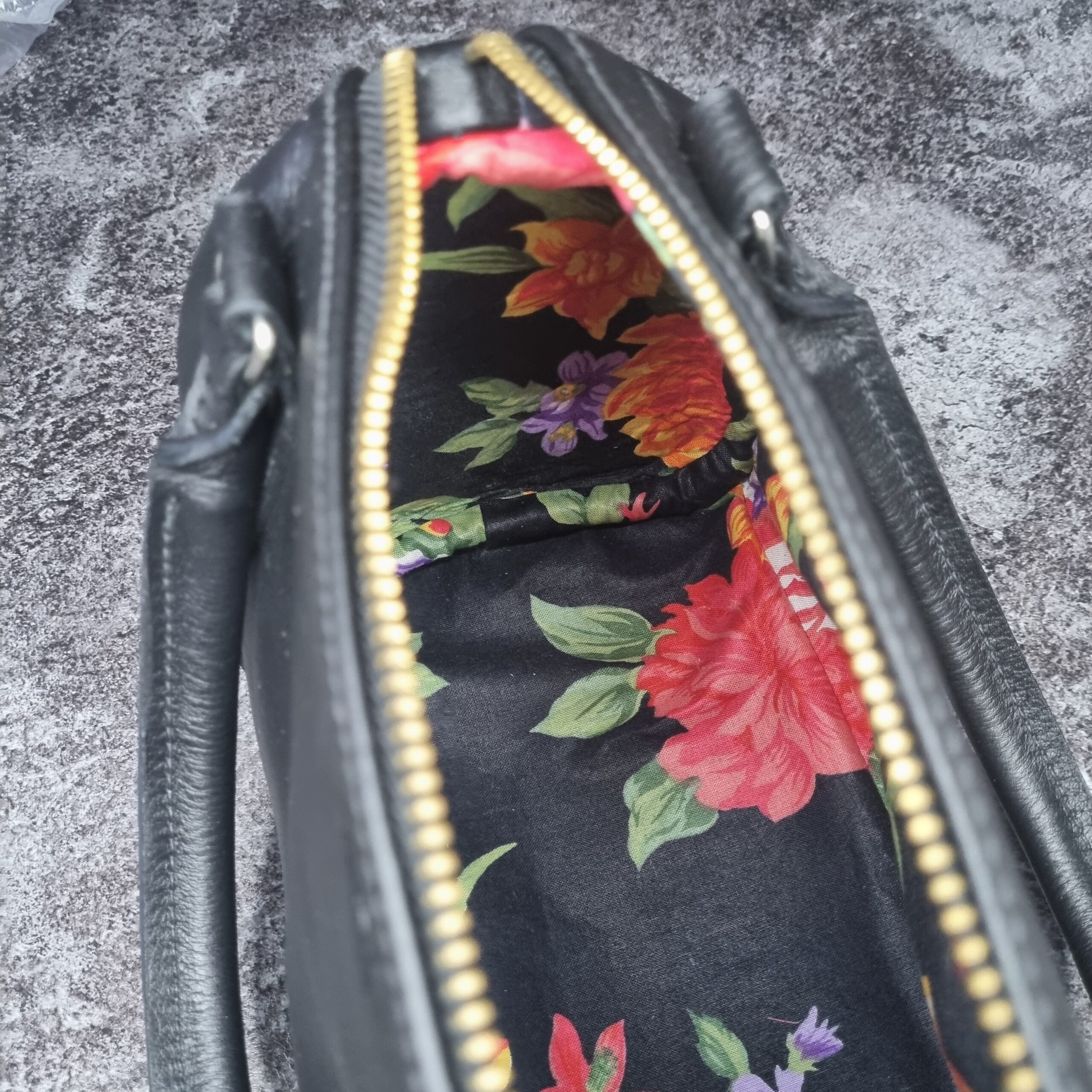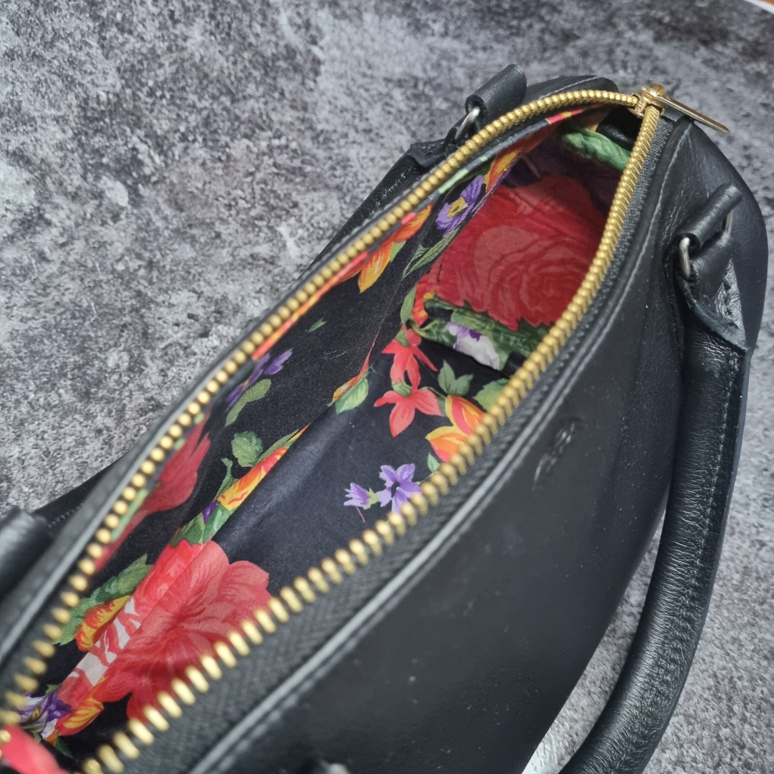 Sac en cuir de veaux noir, bijouterie dorée et argent lisse, intérieur en coton imprimé fleuris sur fond noir , grande espace intérieure, système d’ouverture zip