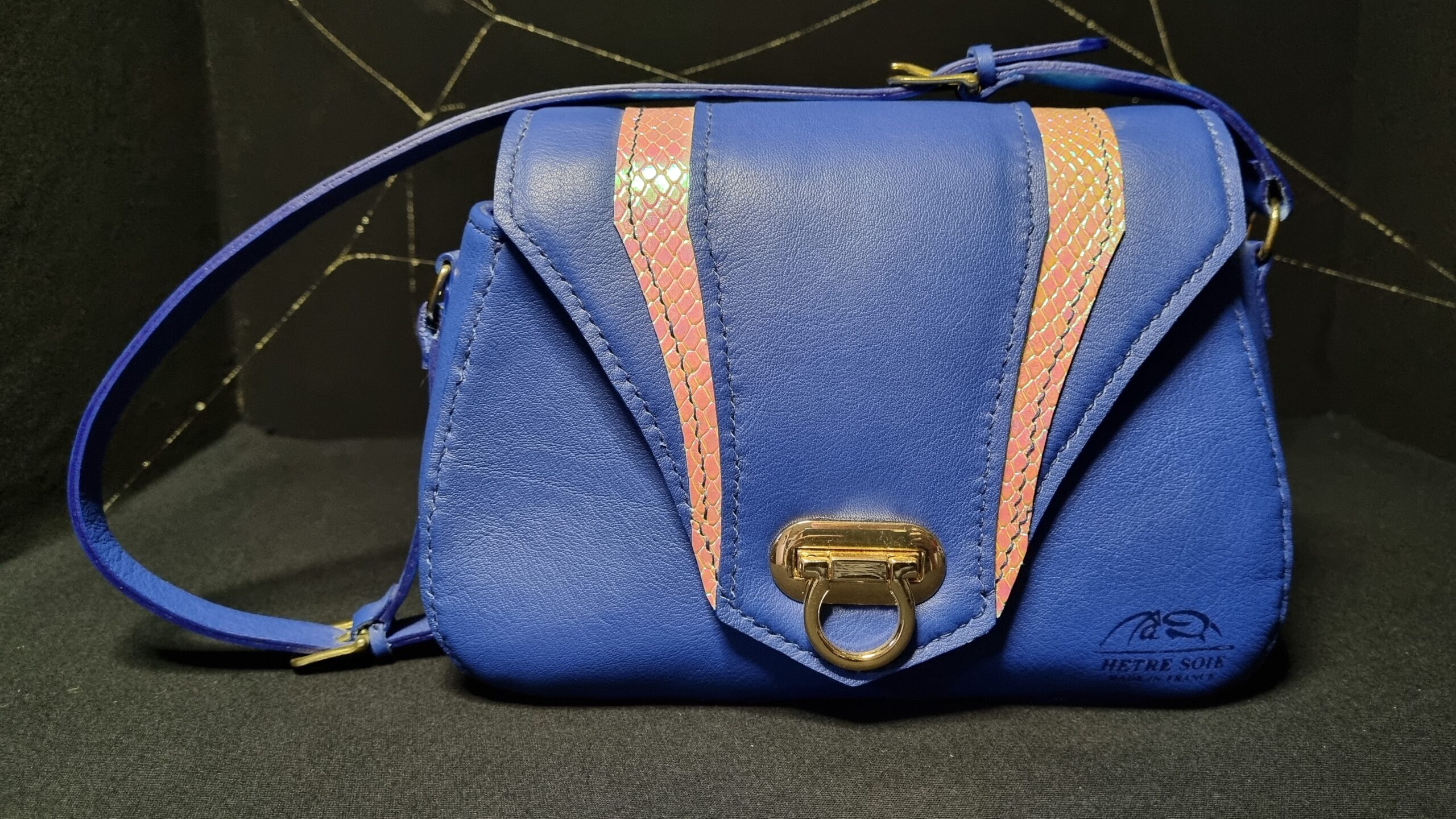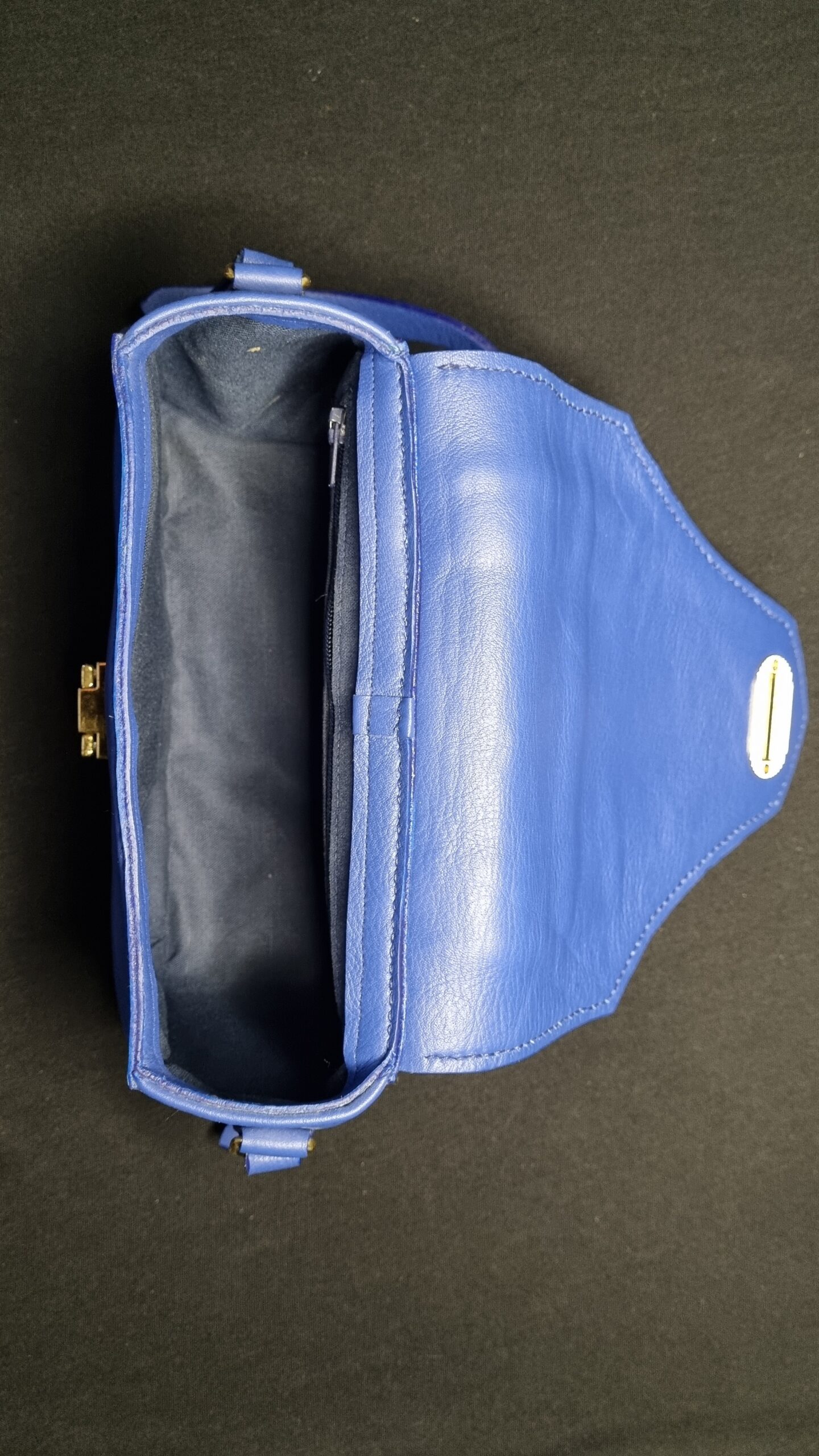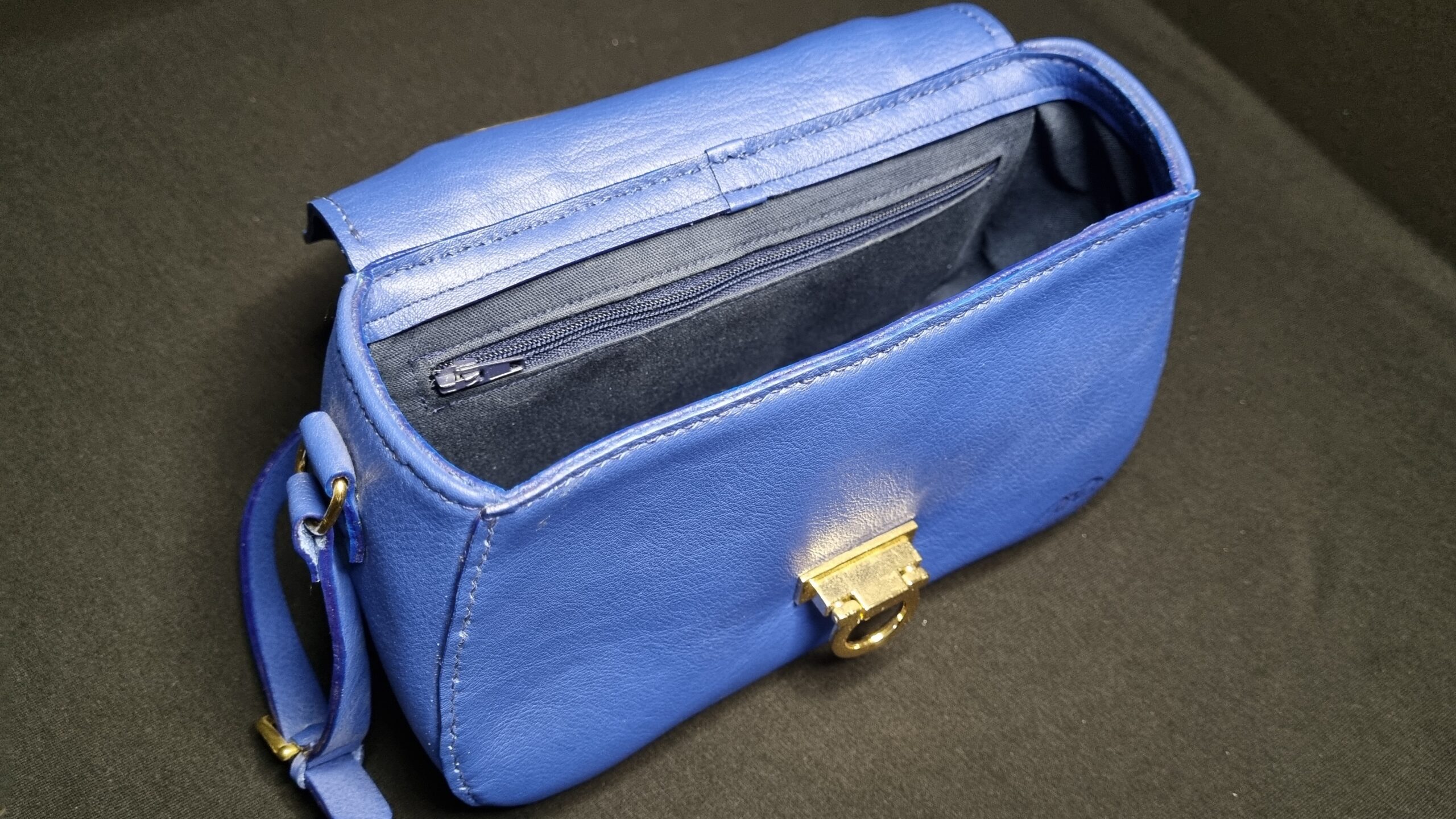 Sac en cuir de chèvre teinte bleu électrique et intérieur en coton bleu marine, bijouterie dorée, grande poche centrale et poche zip intérieur