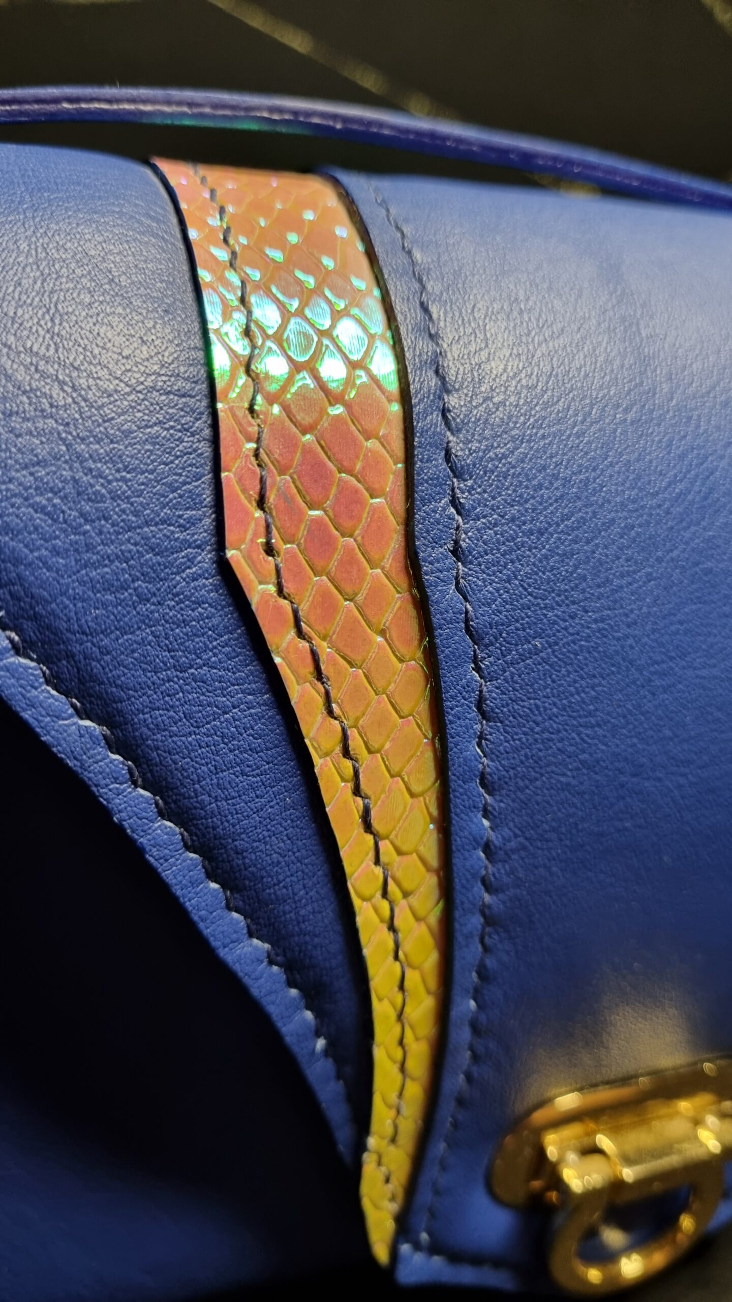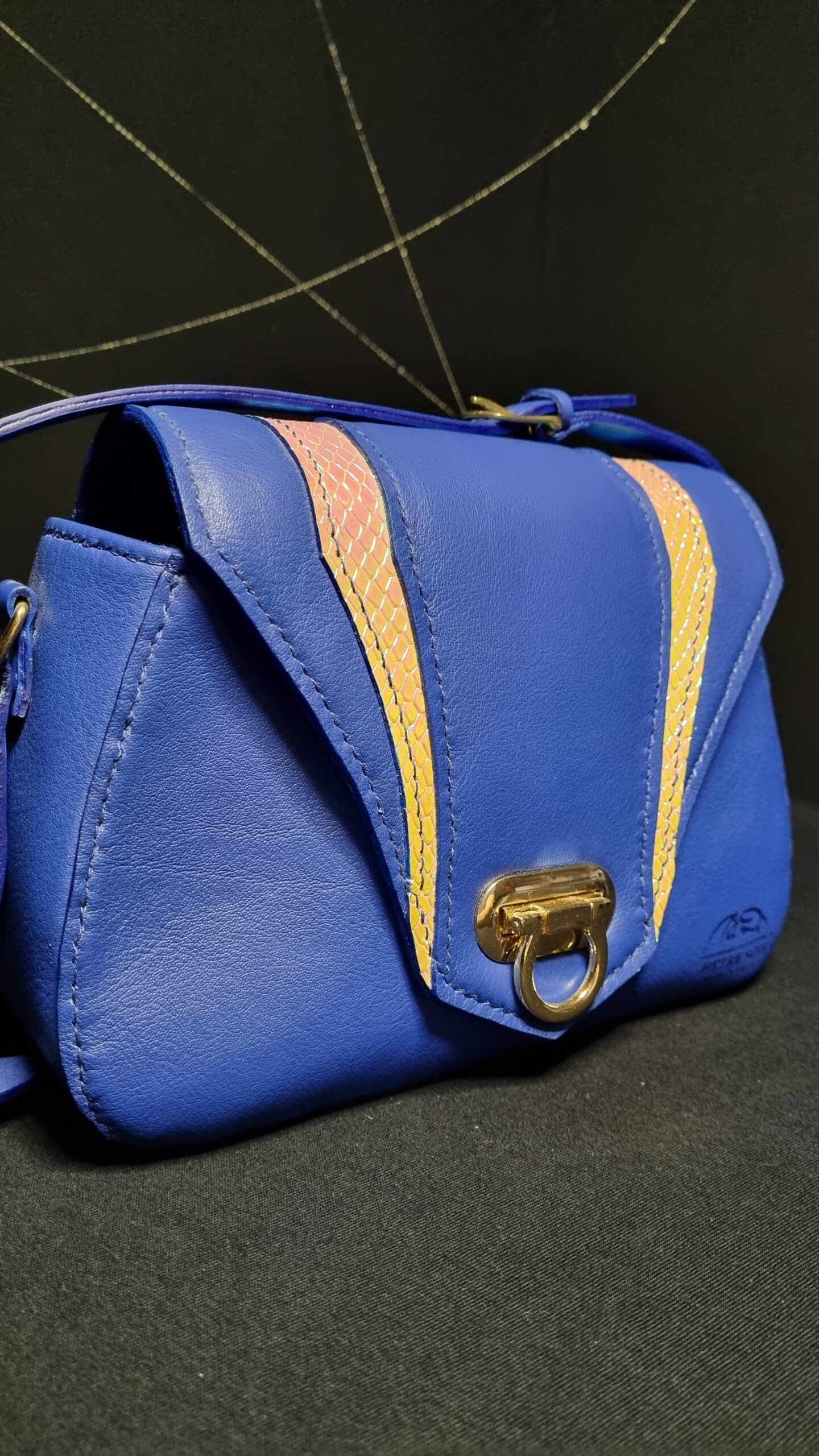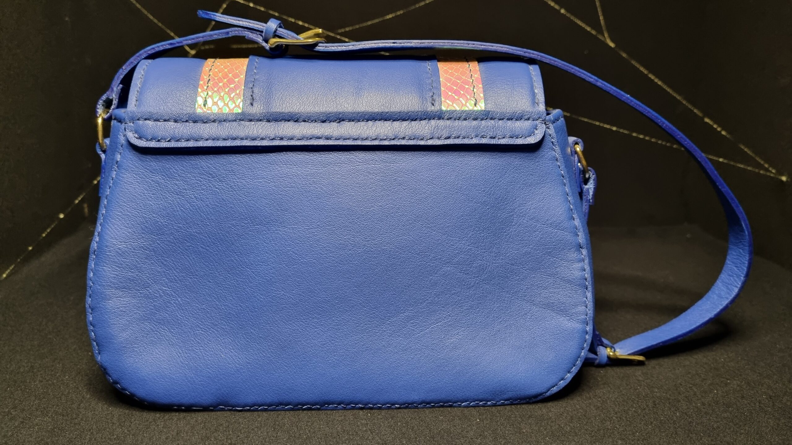 Sac en cuir de chèvre teinte bleu électrique et intérieur en coton bleu marine, bijouterie dorée, grande poche centrale et poche zip intérieur
